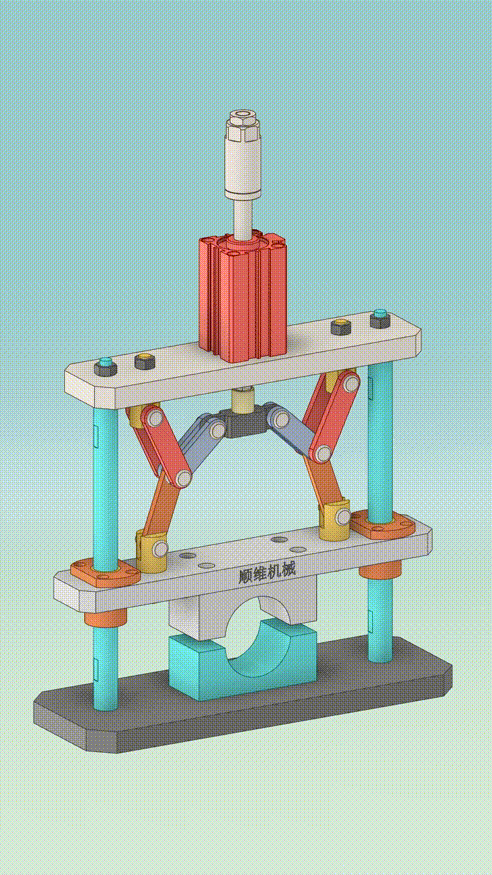 通过气缸带动连杆机构,向下压合时实现自锁,如果气缸不缩回,就会保持锁定状态