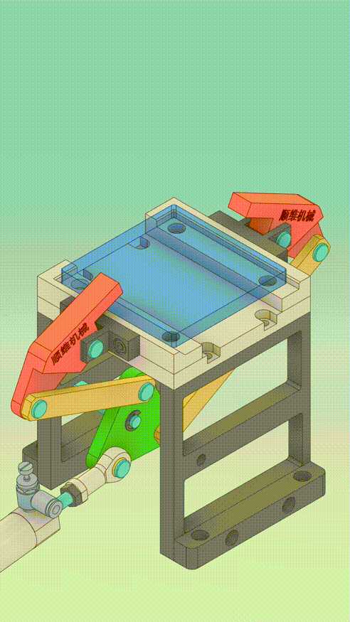 通过气缸驱动连杆机构实现两侧夹爪同步动作