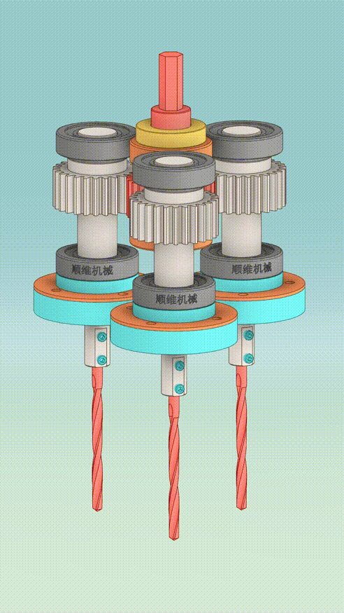 该机构通过中间的传动轴转动,利用齿轮带动外围的三个行星轮实现往同一方向转动