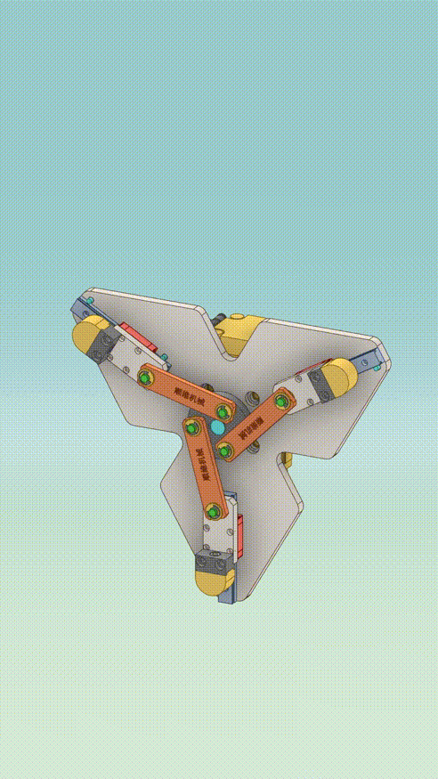 以旋转气缸为动力源,带动连杆驱动滑块,实现三角的外撑与缩回动作