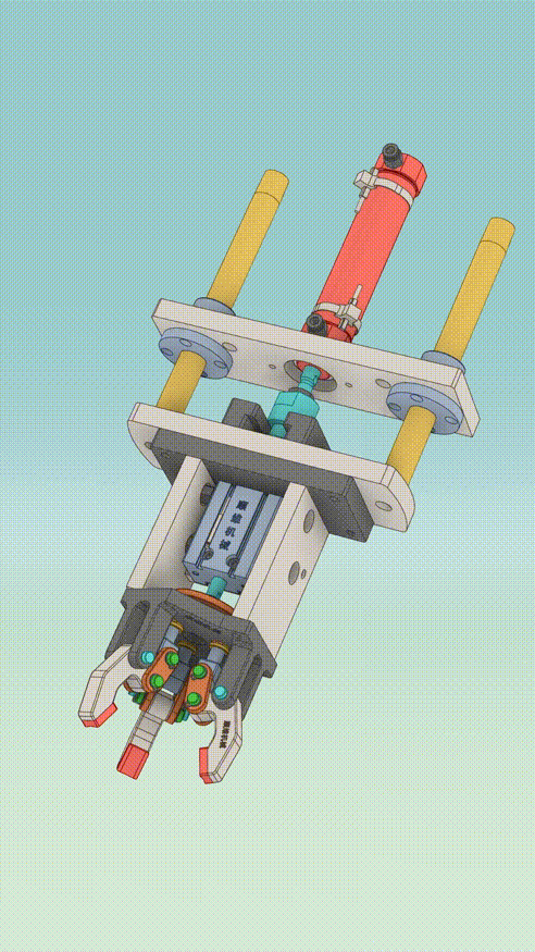 上面的气缸负责升降运动,底部气缸驱动连杆机构实现夹爪的开合动作