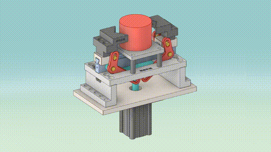 通过气缸的伸缩带动连杆,实现两个夹爪往中间靠拢和背离