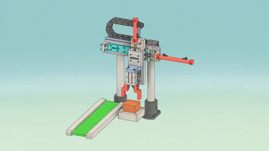通过两组气缸的堆叠,分别实现了上下和左右运动,通过手指气缸实现取放料动作